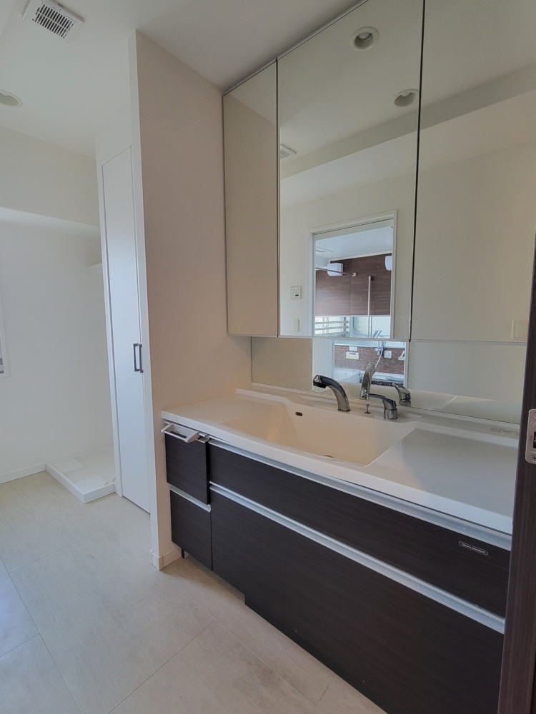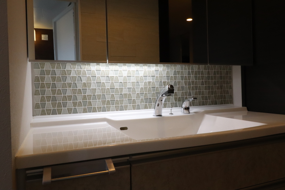 このように水回りはそのままでも各所にタイルや照明など配置することで