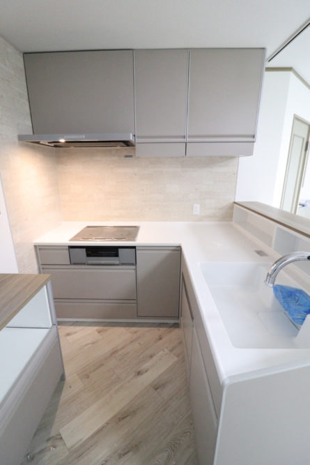 L型キッチン絵人造大理石カウンターも清潔感満載ですね。