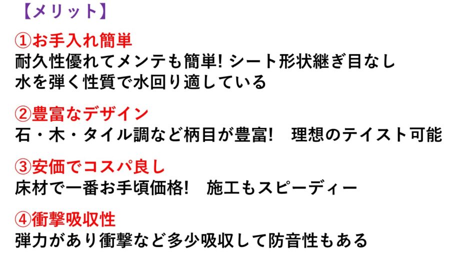 またクッションフロアのメリットデメリットも資料入れておきます!