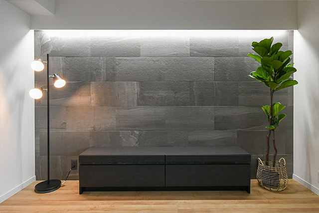 リビングテレビ面にエコカラット張りと上部にエコカラットをより引き立てる間接照明で仕上げます。