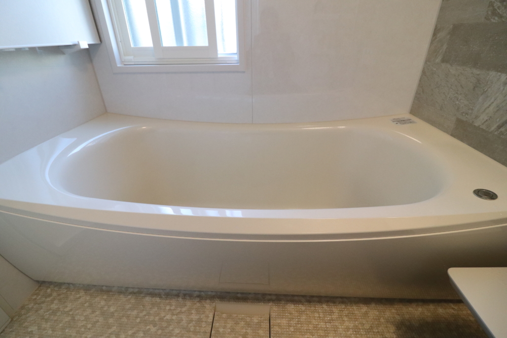 浴室は人気シリーズのTOTOサザナ1616設置。壁はプレミアムグレードのパティオベージュ色で上品なデザインであり浴槽も人大浴槽で見た目も良くなるだけでなく汚れや傷に強く何より色あせが少なく長く使えるのでとってもオススメです。
