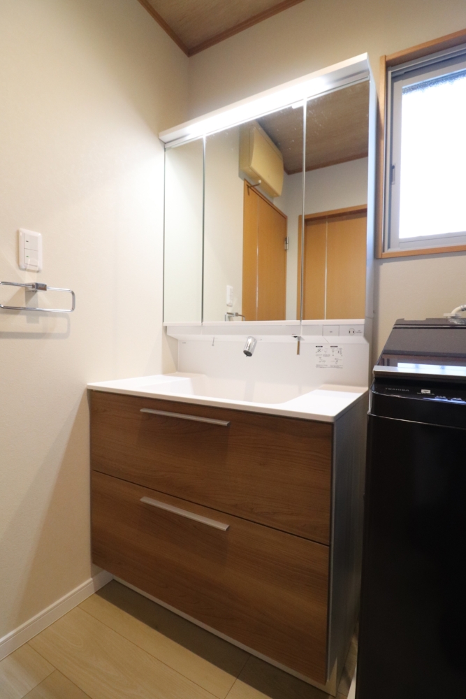 洗面所は窓もあることで浴室面壁を補強して木目柄可動式造作棚を設置して色々なものも上手く収納出来るようになりました。