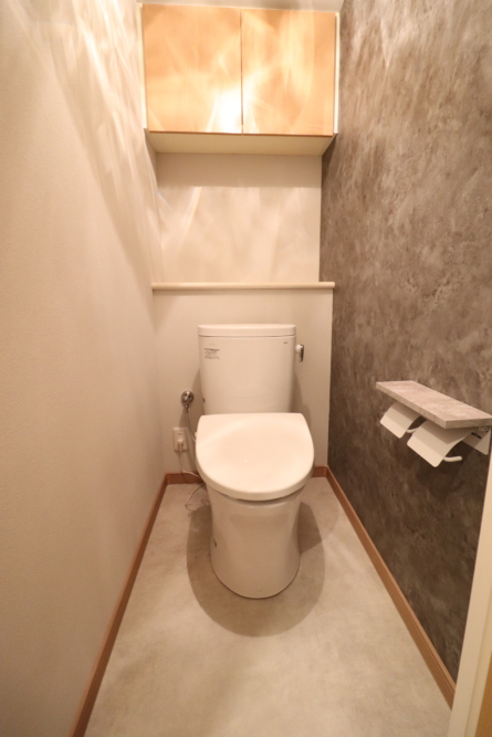 幅木も合わせて全て取替させていただきました。バスルームは同じサイズですが高断熱浴槽で木目柄も素敵なバスルームへ変わり洗面所やトイレもクロス柄など落ち着きある色合いでまとめました。
