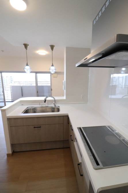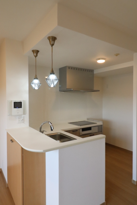 キッチンはL型ですが吊り戸棚が閉鎖的だったので吊り戸棚のないペンダント照明で開放的キッチンへ変わりました。