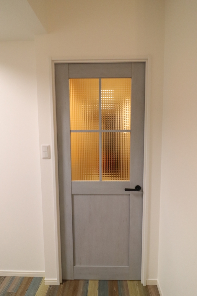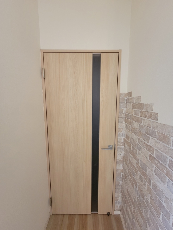 リビング入口ドアも勝手向きを変えてハンドメイド風なデザインに合わせて取替させていただきました。