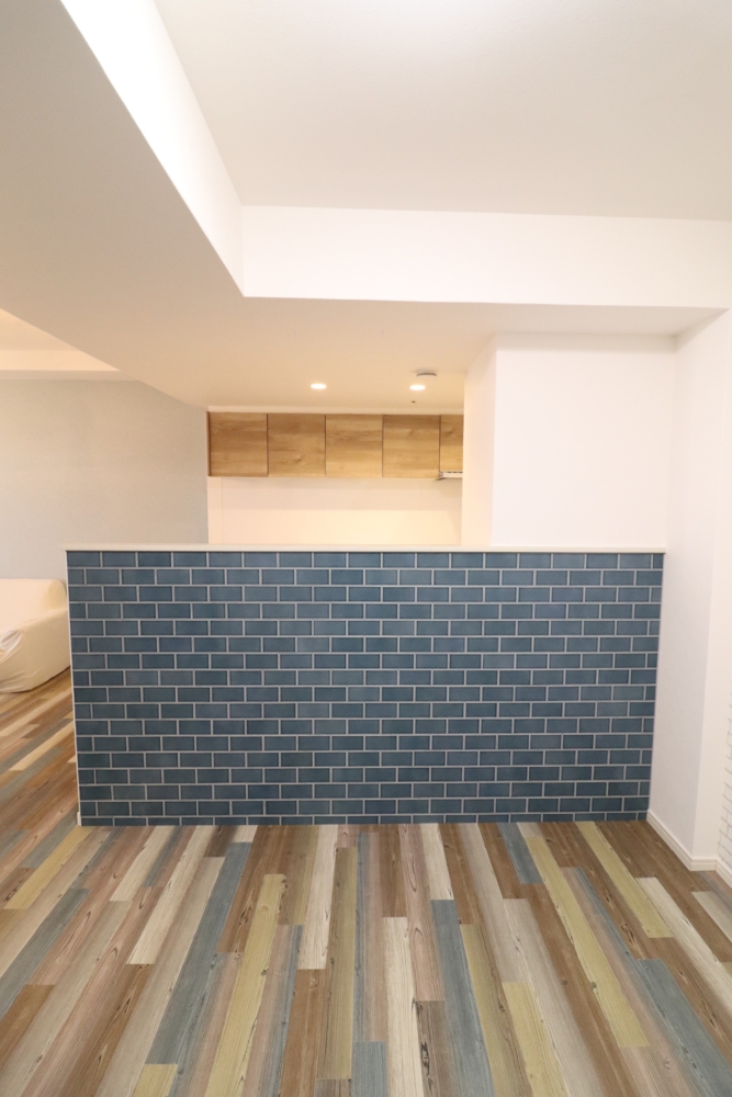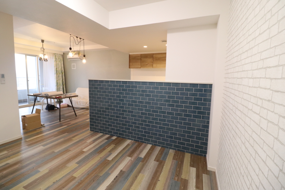 キッチンとカップボード面の壁を30cm程度近くして新規壁作成しました。冷蔵庫面は壁を作りリビングから見えないような形をとりカップボード面も電子レンジなど置いても裏側が見えないように高さ128cmで腰壁作成しました。腰壁下はお客様のお選びされた名古屋モザイクタイル張りでよりオシャレな空間へ変わりました。