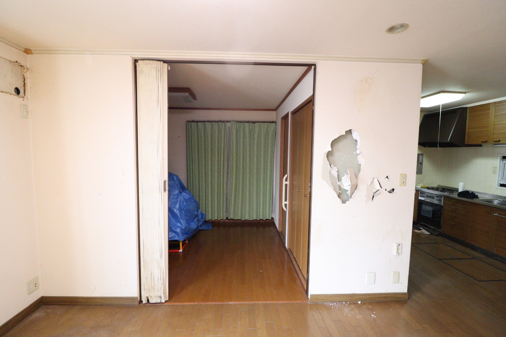 和室は押し入れからクローゼットへ変わりリビングと段差なく繋げることで広いリビング空間へ変わり奥に続くアコーディオンカーテンから2枚引き違い戸を設置させていただきました。