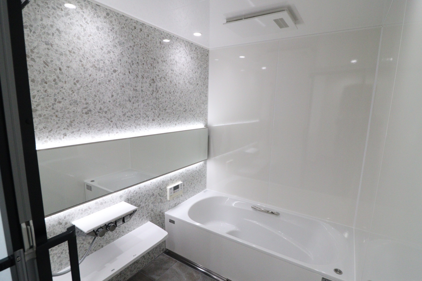 ユニットバス:タカラスタンダード グランスパ1620 アクセント壁テラゾーホワイト色 周辺壁パールホワイト色