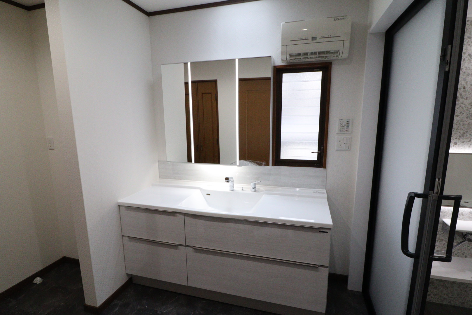 今回正面にある大きな窓は封鎖して断熱性も高めつつ正面ミラーやアクセントパネルも綺麗に仕上がるように変わりました。