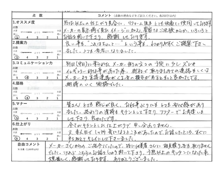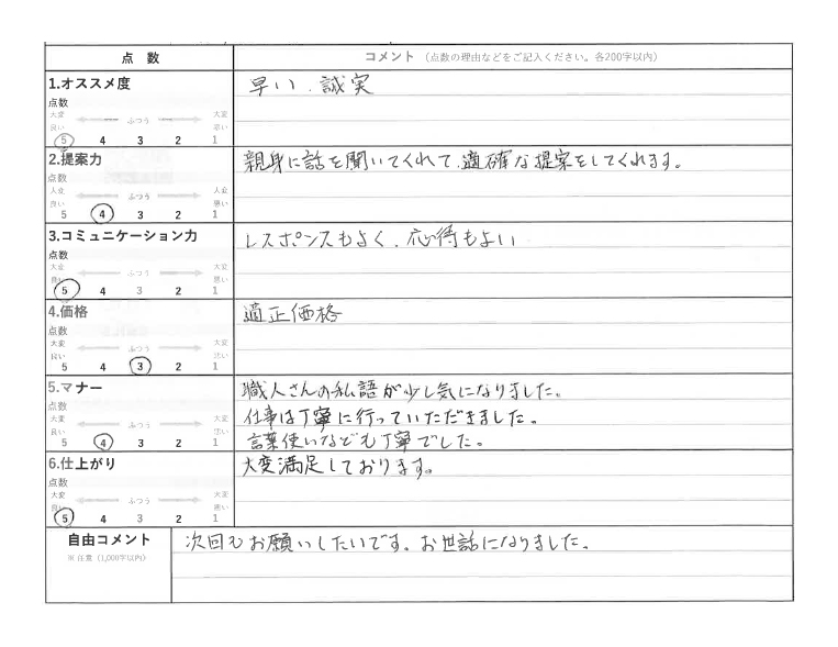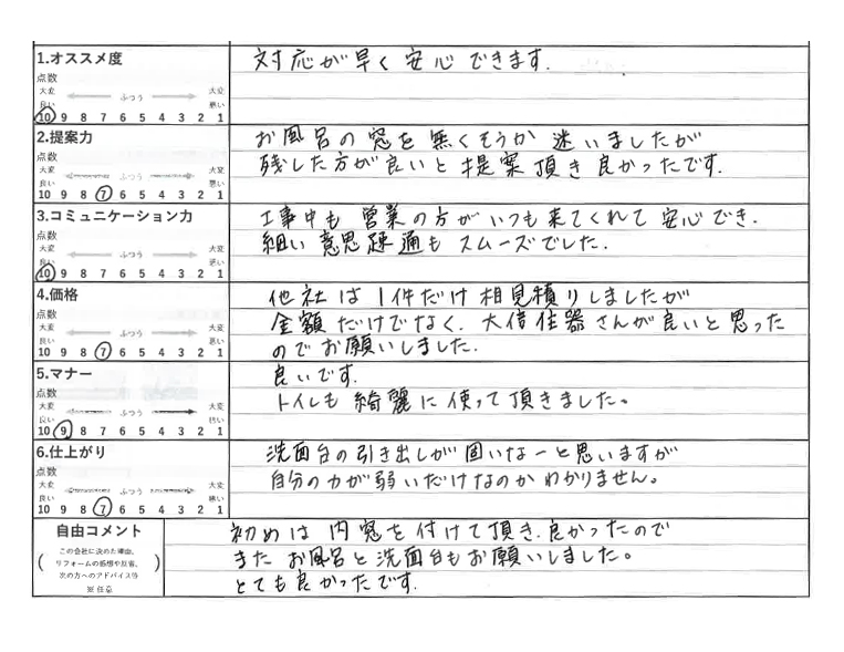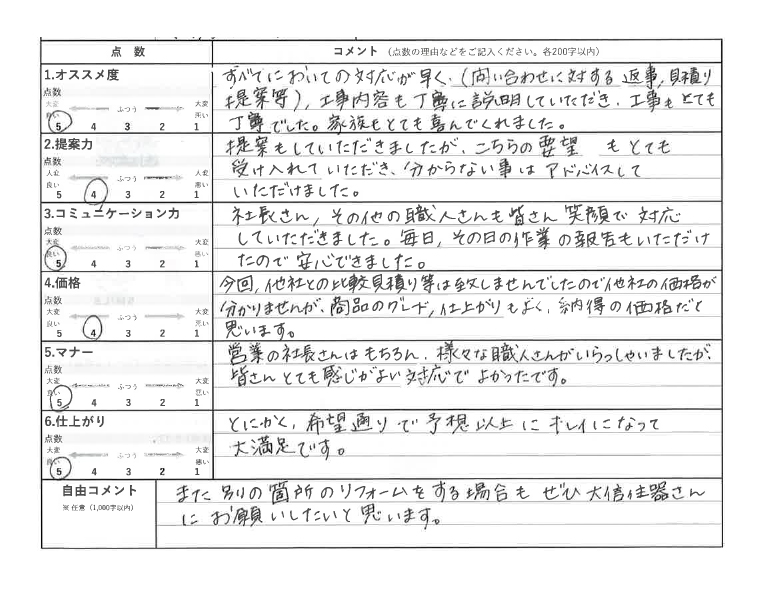 すべてにおいての対応が早く(問い合わせに対する返事、見積り提案等)、工事内容も丁寧に説明していただき、工事もとても丁寧でした。家族もとても喜んでくれました。 [続きを読む]