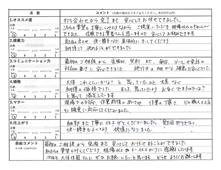 打ち合わせから完了まで、安心してお任せできました。こちらの要望を丁寧にくみとりながら、ご提案いただき、想像以上のリフォームができました。信頼できる業者さんと思いますので、安心しておすすめできます。 [続きを読む]
