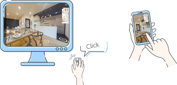 スマートフォンやタブレット、パソコンでも360度操作できるので、いろいろな⾓度からお部屋がご覧いただけます。